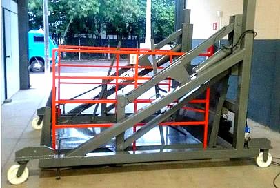Mesa: medindo 1800 mm de largura x 2000 mm de comprimento, de área plana, mais a rampa/ponte (outras medidas sob consulta), com piso em chapa corrugada (tipo xadrez), antiderrapante.