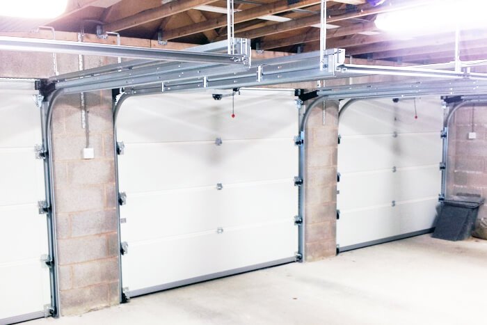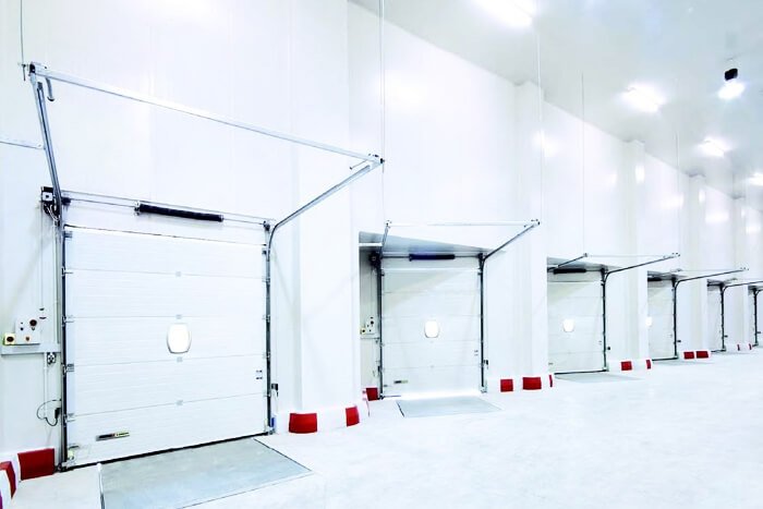 As guias são de aço galvanizado de 2 mm de espessura com orifícios de fixação, que permitem uma regulagem rápida na instalação. As dobradiças de aço galvanizado de 2,5mm, especialmente fabricadas para esse tipo de portas, suporte regulável para os eixos laterais, onde serão fixados os rodízios de nylon com rolamentos, para deslizar com suavidade e sem ruído nas guias laterais. Acionamento feito através de molas de torção, que equilibram constantemente o peso das portas, conseguindo um funcionamento suave, tanto na abertura, quanto no fechamento. Estas molas são calculadas e fabricadas em função do peso, das dimensões e dos ciclos das portas. Os painéis serão pintados com uma demão de prymer de 10 microns sobre o galvanizado e uma pré – lacagem de acabamento em poliéster de 15 microns na cor “BRANCA” e serão fornecidas com uma linha de visor de acrílico.